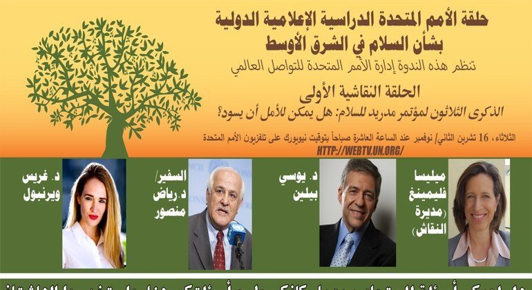 وتُعقد أول حلقة نقاشية يوم الثلاثاء 16 تشرين الثاني/نوفمبر، بعنوان “الذكرى الثلاثون لمؤتمر مدريد للسلام: هل يمكن للأمل أن يسود؟” حيث تدير النقاش وكيلة الأمين العام لإدارة التواصل العالمي، ميليسا فليمينغ، ويشارك فيه يوسي بيلين، الوزير الإسرائيلي السابق وعضو الكنيست السابق؛ د. رياض منصور، مراقب فلسطين الدائم لدى الأمم المتحدة؛ وغريس ويرنبول، الخبيرة الأميركية في شؤون الشرق الأوسط، والباحثة غير المقيمة في معهد الشرق الأوسط.
