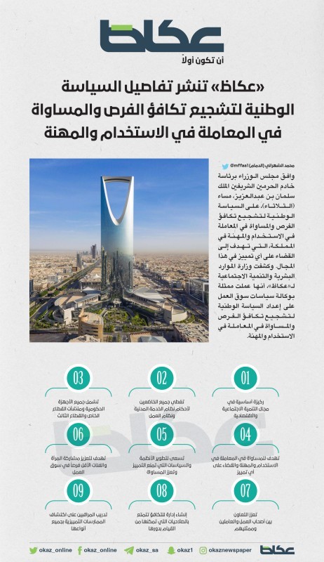 «عكاظ» تنشر تفاصيل السياسة الوطنية لتشجيع تكافؤ الفرص والمساواة في المعاملة في الاستخدام والمهنة