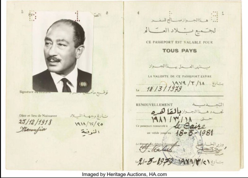 وأعلنت «هيريتغ» في ولاية تكساس بيع جواز سفر الرئيس المصري الراحل محمد أنور السادات بـ 47,500 دولار، يوم 22 فبراير 2023.