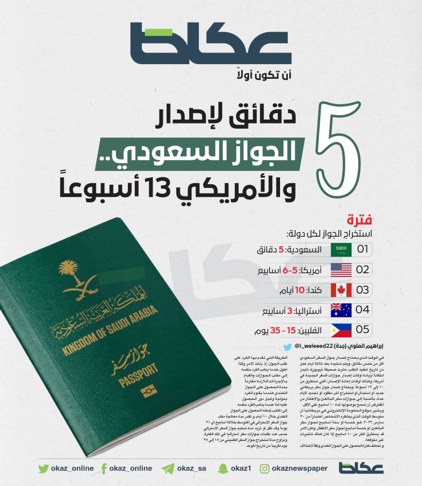 في الوقت الذي يحتاج إصدار جواز السفر السعودي أقل من خمس دقائق، ويتم تسليمه بعد ثلاثة أيام عمل من تاريخ تنفيذ الطلب، نشرت صحيفة نيويورك تايمز انتقاداً لزيادة أوقات إصدار جوازات السفر الجديدة في أمريكا، وكذلك أوقات إعادة الإصدار، التي تستغرق من 10 إلى 13 أسبوعاً. ويحتاج إصدار جواز سفر بريطاني جديد أو استبدال أو استخراج آخر مفقود أو تجديد لأيام عدة، بالنسبة إلى جوازات سفر البالغين والأطفال من المفترض أن تسمح بوصولها لمدة 10 أسابيع على الأقل.