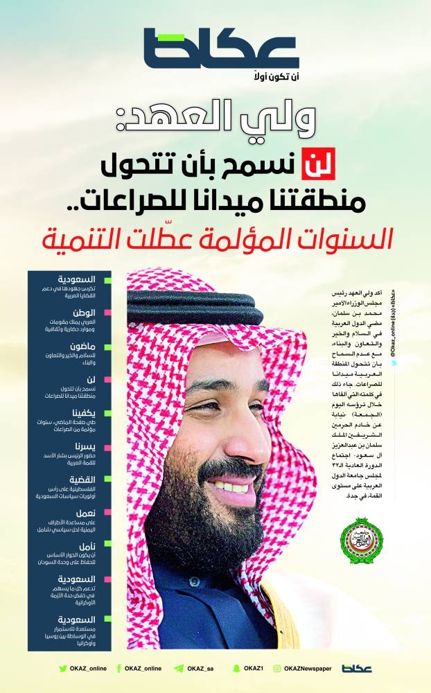 أكد ولي العهد رئيس مجلس الوزراء الأمير محمد بن سلمان، مضي الدول العربية في السلام والخير والتعاون والبناء، مع عدم السماح بأن تتحول المنطقة العربية ميدانا للصراعات.