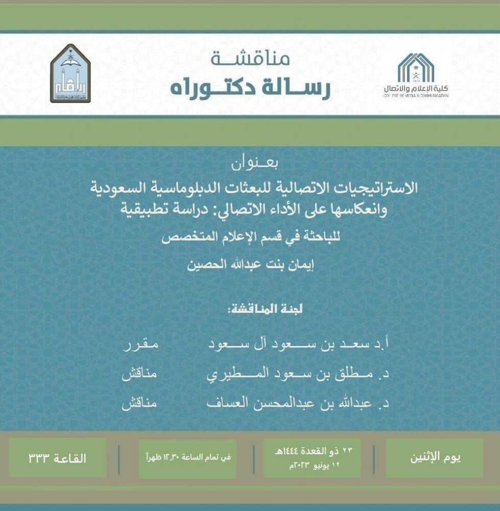 حصلت إيمان بنت عبد الله الحصين على درجة الدكتوراه بإمتياز ، من جامعة الإمام محمد بن سعود الإسلامية في الرياض، بعد مناقشة رسالتها في قسم الإعلام المتخصص بعنوان “الاستراتيجيات الاتصالية للبعثات الدبلوماسية السعودية وانعكاسها على الأداء الاتصالي – دراسة تطبيقية”، بحضور عميد كلية الإعلام والاتصال الأمير الدكتور سعد بن سعود مقرراً للجلسة، وأستاذ الإعلام السياسي الدكتور عبدالله بن عبدالمحسن العساف مناقشاً، وأستاذ الإعلام السياسي بجامعة الملك سعود الدكتور مطلق بن سعود المطيري مناقشاً.