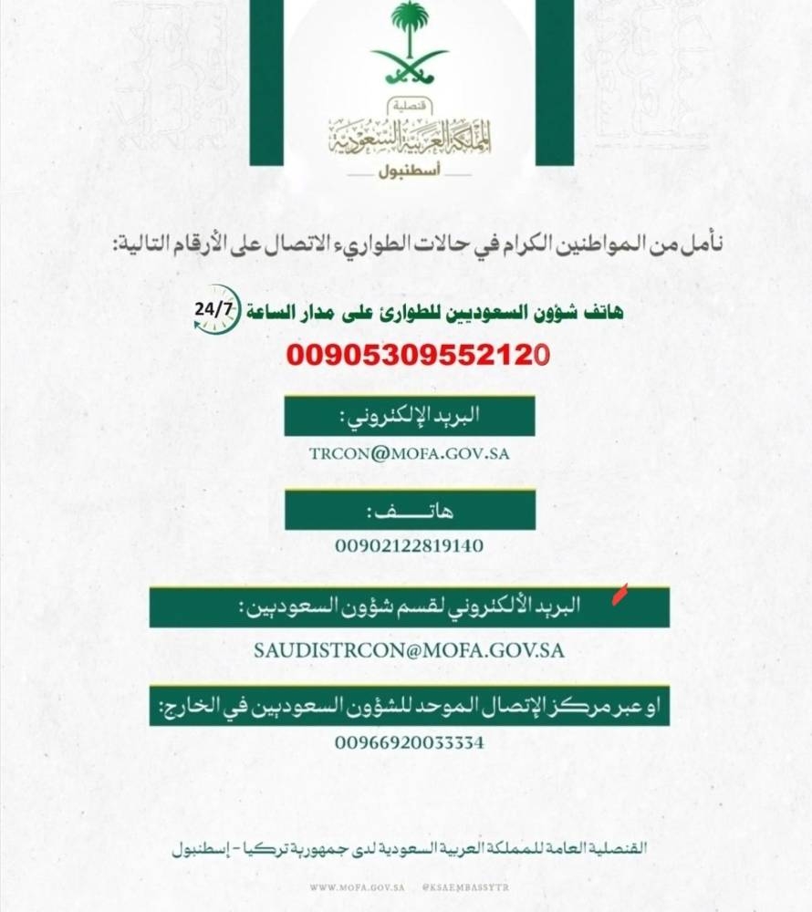وأشارت القنصلية عبر حسابها على موقع تويتر إلى أنه في حالات الطوارئ يمكن التواصل مع القنصلية عبر أرقام الطوارئ على مدار الساعة.