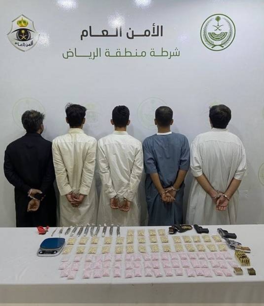 قبضت إدارة التحريات والبحث الجنائي بشرطة منطقة الرياض على مقيم من الجنسية الباكستانية و4 مواطنين لاتخاذهم شقة سكنية وكراً لترويج 7,500 قرص من مادة الإمفيتامين المخدر، و10,000 قرص خاضع لتنظيم التداول الطبي، ومادة الحشيش المخدر، وضبط بحوزتهم 4 أسلحة نارية وذخيرة حية، وجرى إيقافهم واتخاذ الإجراءات النظامية بحقهم، وإحالتهم للنيابة العامة.