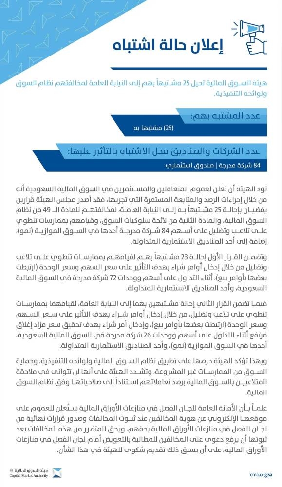 أصدر مجلس هيئة السوق المالية قرارين يقضيان بإحالة 25 مشتبهاً به إلى النيابة العامة، لمخالفتهم للمادة الـ 49 من نظام السوق المالية، والمادة الثانية من لائحة سلوكيات السوق، وقيامهم بممارسات تنطوي على تلاعب وتضليل على أسهم 84 شركة مدرجة أحدها في السوق الموازية (نمو)، إضافة إلى أحد الصناديق الاستثمارية المتداولة.