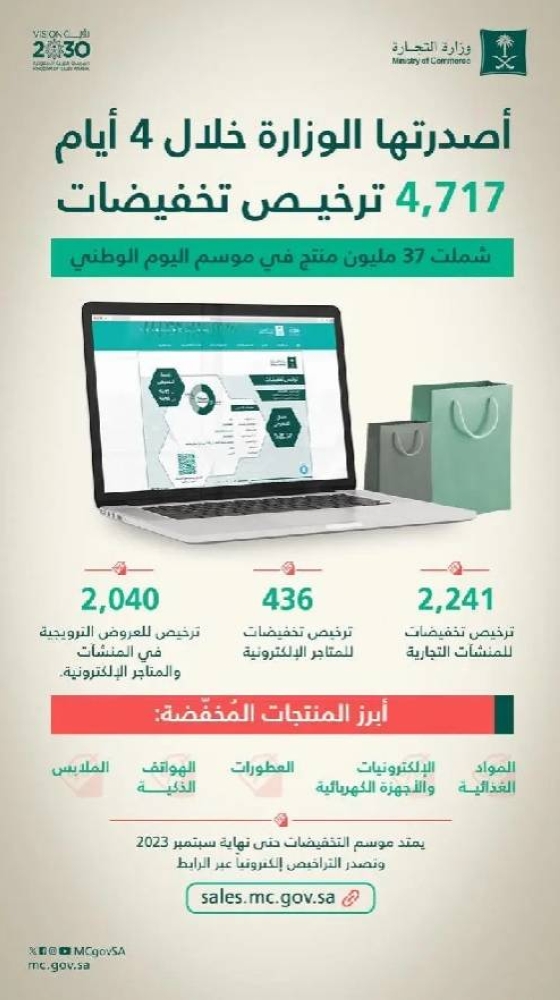 أعلنت وزارة التجارة إصدار أكثر من 4,700 ترخيص للتخفيضات والعروض الترويجية للمنشآت التجارية والمتاجر الإلكترونية في جميع مناطق المملكة بمناسبة اليوم الوطني، وذلك خلال 4 أيام من بداية موسم التخفيضات الذي يمتد حتى نهاية سبتمبر 2023.