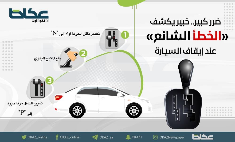 وأكد أنه عند إيقاف السيارة ونهاية الرحلة، يجب تغيير ناقل الحركة أولا إلى «N» وليس إلى «P»، ثم رفع المكبح اليدوي، ثم تغيير الناقل مرة أخيرة إلى «P»، قبل إطفاء المحرك وإخراج المفاتيح.