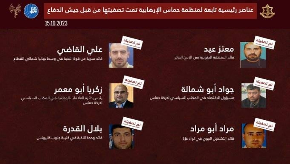 نشر المتحدث باسم جيش الاحتلال الإسرائيلي أفيخاي أدرعي، على حسابه على موقع «إكس» (تويتر سابقا)، اليوم (الإثنين)، صور وأسماء 6 من قادة حركة حماس السياسيين والعسكريين الذين قتلوا في الحرب على قطاع غزة.