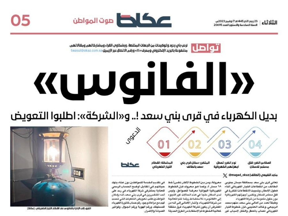 وأوضحت الشركة ردًا على ما نشرته «عكاظ» يوم الثلاثاء ٧ نوفمبر ٢٠٢٣ بعنوان:«الفانوس» بديل الكهرباء في قرى بني سعد.. و«الشركة»: اطلبوا التعويض”؛ أنه تم التعامل معها في حينه وإعادة الخدمة للمشتركين المتأثرين. مشيرة إلى أن الشركة تقوم بصورة مستمرة بتطوير البنية التحتية لشبكات الكهرباء، حيث تم تنفيذ عدة مشاريع بقرى بني سعد بتكلفة إجمالية تجاوزت 12 مليون ريال، شملت تعزيز وتحسين وأتمتة مكونات الشبكة الكهربائية لرفع موثوقية الخدمة.