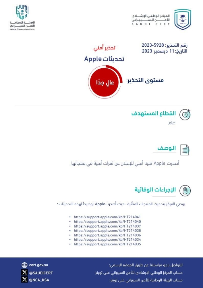أصدر المركز الوطني الإرشادي للأمن السيبراني تحذيراً أمنياً عاماً – في مستوى «عالٍ جداً» – خاصاً ببعض منتجات شركة Apple؛ بسبب وجود ثغرات أمنية في المنتجات.