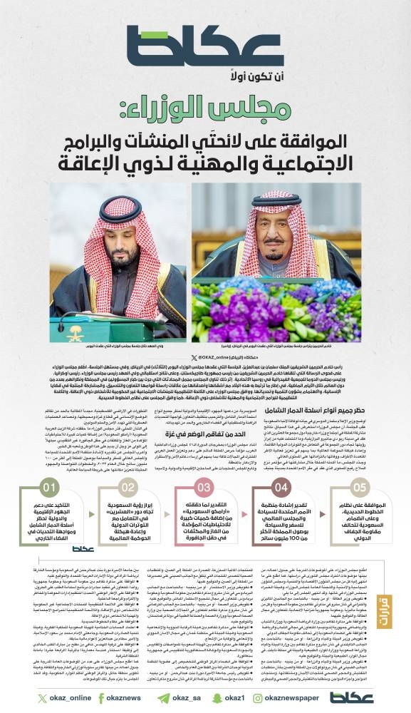 كما اطّلع مجلس الوزراء، على عدد من الموضوعات العامة المدرجة على جدول أعماله، من بينها تقارير سنوية لوزارتَي الخارجية والثقافة، وهيئة تطوير منطقة حائل، والمركز الوطني لنظم الموارد الحكومية، وقد اتخذ المجلس ما يلزم حيال تلك الموضوعات.